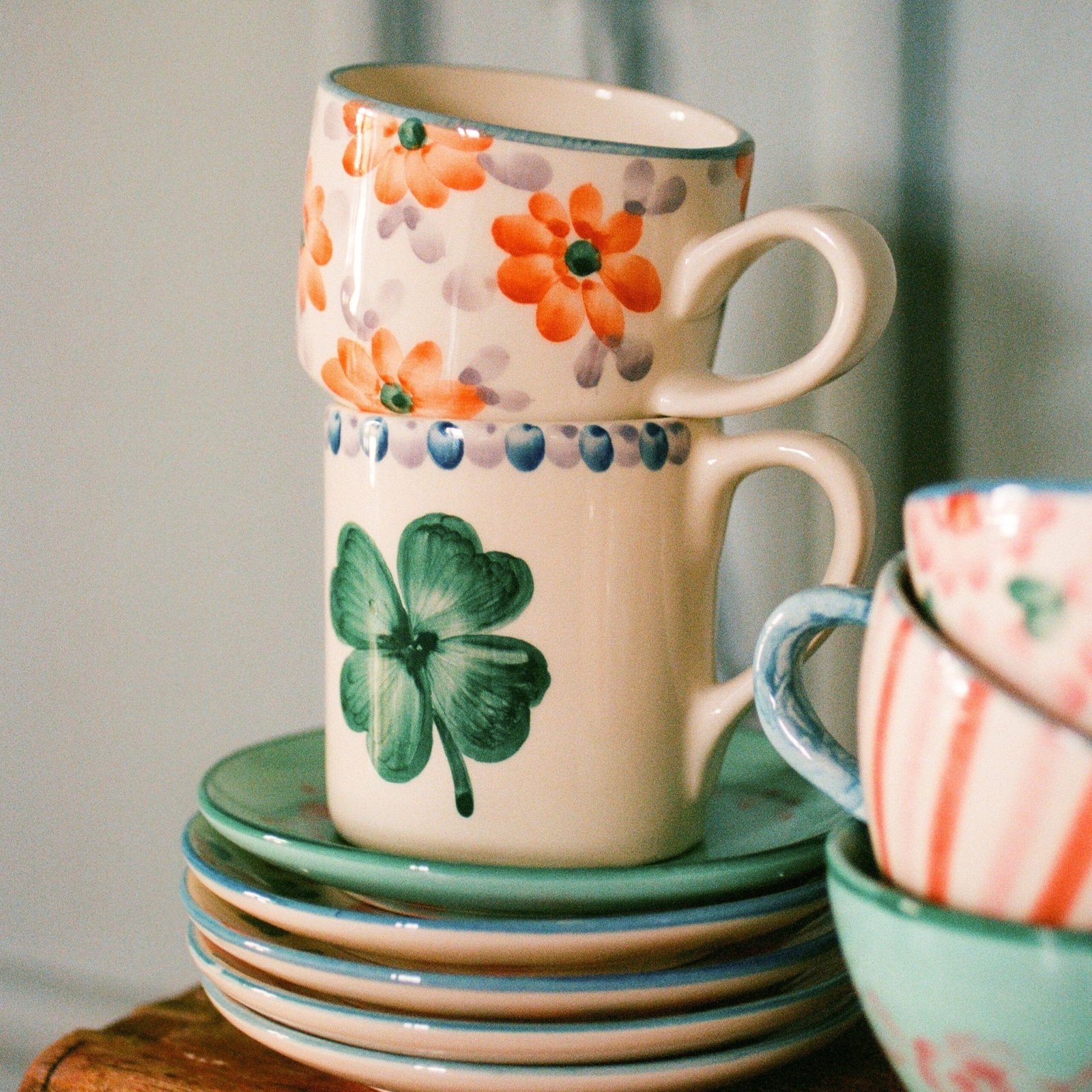 Charming ceramic coffee mug with a hand-painted motif of a lucky four-leaf clover. The mug is hand-painted by a group of fantastic Portuguese women. making each individual mug completely unique. We find it so charming! To avoid potential ring marks or damage to wooden tables. we recommend using a coaster when placing hot beverages in your ceramic cups or mugs. Heat can sometimes cause moisture to seep into the surface. which may leave marks over time. Protect your furniture with this simple step!